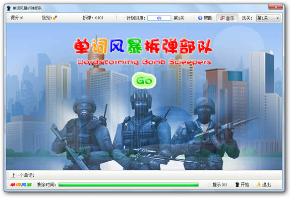 拆弹部队游戏背单词——紧张刺激的单词拼写游戏!博客介绍:单词风暴之拆弹部队,最有趣且永远不会厌烦的背单词拼写方式单词风暴的拆弹部队游戏背单词智能记忆系统是一个应用遗忘曲线的背单词拼写游戏。伴随着动感的音乐,输入拆除每一个炸弹的关键密码来拆除炸弹。随着关数越来越多,要输入的密码也越来越多,难度更大!在游戏中不知不觉中就轻松地牢记了单词的拼写。 下图是进入单词风暴拆弹部队游戏背单词智能记忆系统后的初始画面,点击“Go”或者开始按钮就能开始游戏了: