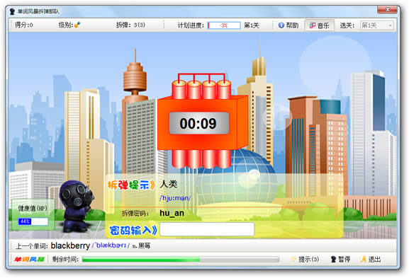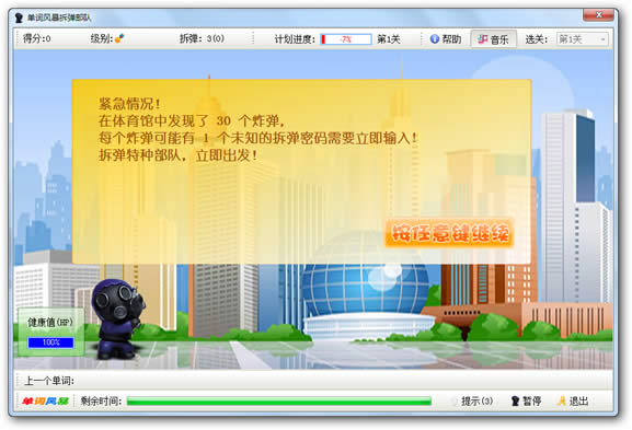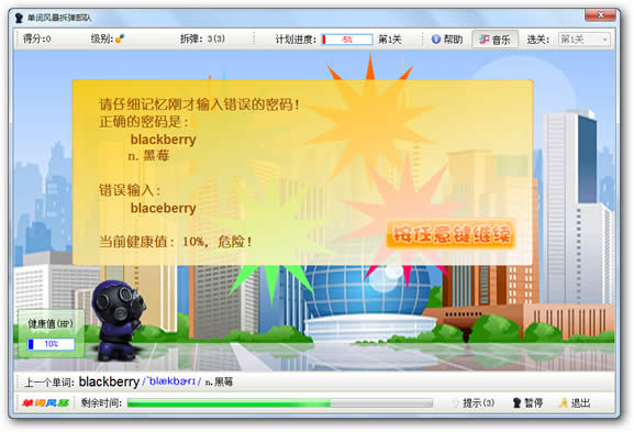 输入丢失的字母即可拆弹(不需要输入完整单词),如果输入错误,或者在限定时间内没有输入正确,则炸弹爆炸,拆弹专家的健康值会减少,如果减少到0则本次任务失败:
