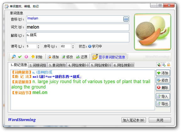 可以点单词的“查找/编辑/助记”按钮,查看更多的单词详细信息,包括助记信息、词根词缀、单词例句、网络搜索等: