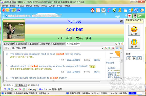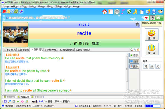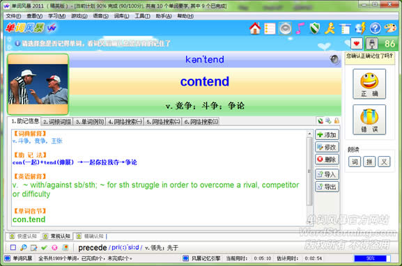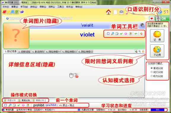 • 实用学习快捷键:End:完成单词学习;Delete(Del):删除单词;Ctrl+R:恢复上一次进度;F9:当前单词助记;F7:前一单词助记;F4:发音;按住Ctrl答题自动完成单词