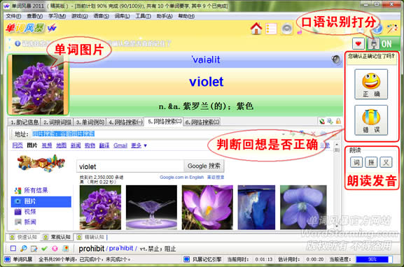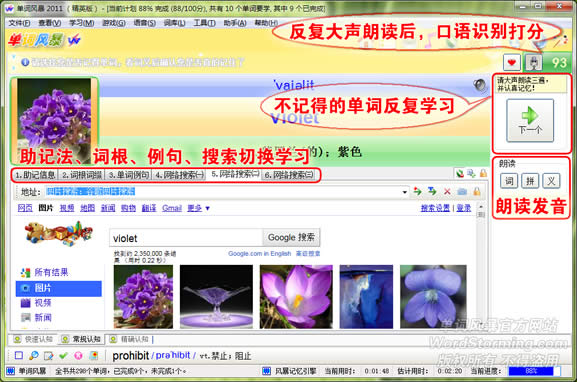 • 通过单词认知、词义认知和听力认知对单词进行回想和认知。利用图片、助记法、例句、音节、词根词缀、网络搜索助记,还可以随意定制。