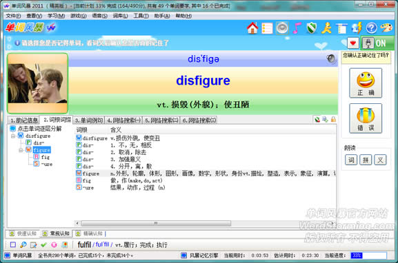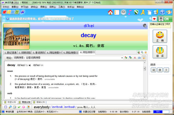 按“记得”按钮后再次确认是否正确记住这个单词,此时可以查看各种助记信息、词根词缀、单词例句、网络搜索等: