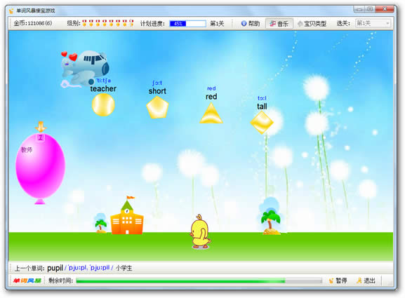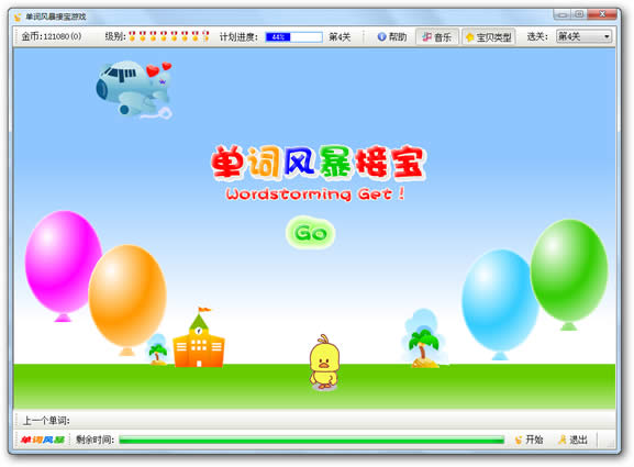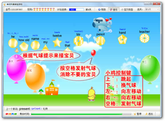 单词风暴的小鸡接宝游戏背单词智能记忆系统是一个应用遗忘曲线的强大的即时动作游戏背单词的学习方法。伴随着动听的音乐,控制小鸡跳起接住飞机下落下来的各种形状的宝贝,一定要接住和气球上提示一致的宝贝,就可以获得金币,不知不觉中就轻松地牢记了大量单词。