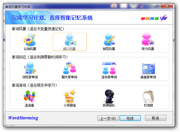 单词风暴有利于大脑中整体记忆链的形成,并通过电脑利用记忆模型对用户的记忆行为过程做出科学地分析,为用户量身定做风暴学习曲线(Storming Learning Curve),切实地提高您的记忆效率。