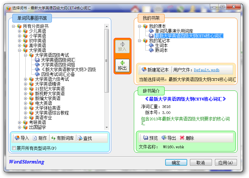 鼠标双击左边“未使用的辞书”可将书本放入“我的书架”中;