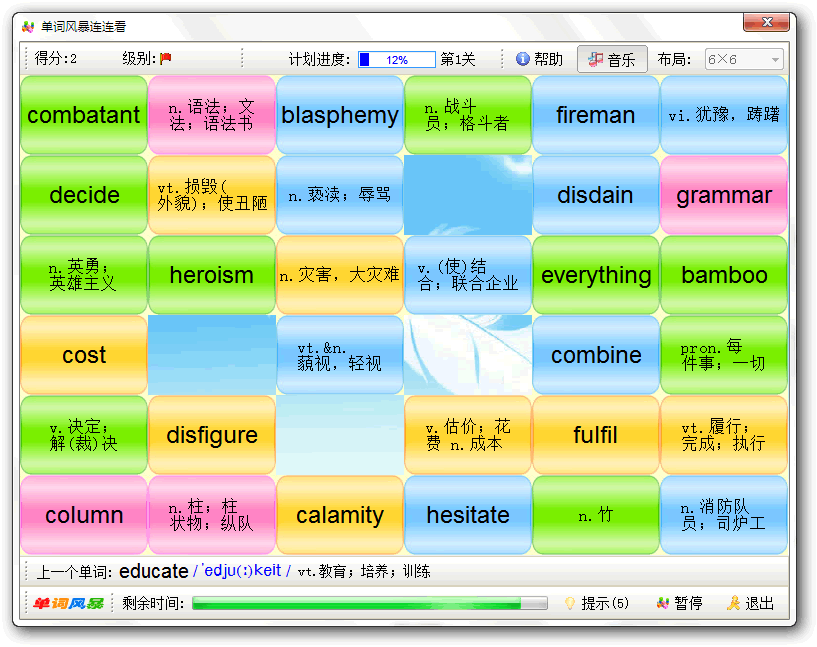 - 在同种颜色的方块中找到匹配的单词和词义(或音标和词义),如果匹配正确则该方块消去,直到所有的方块消除完毕,则本关通过。如果在限定时间内无法消去所有方块,则本关结束。