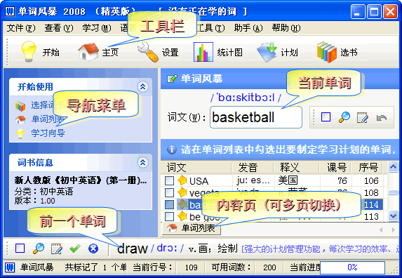 如果您需要建立一个新用户,则可以点击“新用户”按钮创建一个新用户,用户名可以为中文。当您新建一个用户后,用户文件目录(Users目录)里会添加一个以用户名为文件名,ws为扩展名的文件,您的学习进度记录都会保存在这一个文件中。当您重新安装或升级版本后,只要把这个文件再复制到Users目录就可以了。 打开Users目录的方法为依次打开:我的文档->My WordStorming Files->Users。 主画面包括五个主要部分: