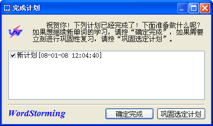 版权申明本文档内容已经过著作权登记。转载时请注明来自于单词风暴官方网站(www.WordStorming.com) | 四、科学地复习当一个计划完成后,会弹出“完成计划”画面。选择“确定完成”,来将这个计划的执行状态从“执行中”设置为“已完成”;也可以选择立刻进行巩固复习。