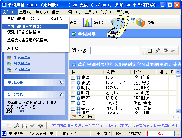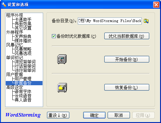 版权申明本文档内容已经过著作权登记。转载时请注明来自于单词风暴官方网站(www.WordStorming.com) | 五、备份数据每台电脑可供多人使用单词风暴。每个用户对应一个文件,该文件保存在Users目录下,形式为[用户名].ws。用户文件中包含着用户学习记录和所有设定。因此,只要备份该文件就可以了。恢复的时候只要将备份的文件拷贝到Users目录下即可,更改文件名即可更改用户名。不过,您也可以使用下面的方法来备份和恢复。 打开Users目录的方法为依次打开:我的文档-> My WordStorming Files-> Users。 备份有两种方法: