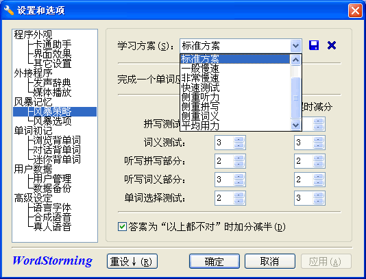 版权申明本文档内容已经过著作权登记。转载时请注明来自于单词风暴官方网站(www.WordStorming.com) | 七、使用设置和选项单词风暴的设置和选项非常丰富,可以定制出个性化的学习、使用方式。更为方便的是,这些设置都保存在单个用户文件中,备份和恢复极其简单。在“首页”中,点击“设置”按钮就可以打开“设置和选项”画面了。 “方案”是一组相关设定的集合。每种方案包含不同的设定,您可以选择已有的方案,也可以新建自己的方案。在“设置和选项”中,“界面效果”、“发声辞典”、“积分策略”,都被设计为方案,使得您可以方便地选择。 单词风暴可以外接任何可以朗读单词的词典进行单词朗读、查找单词的功能。如果您安装了金山词霸,请在“发声辞典”方案中设置正确的辞典版本。如果使用其它发声辞典,则需要在设置和选项中设定,具体操作如下: