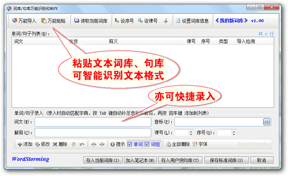 万能词库制作——极其方便的词库制作功能博客介绍:万能词库制作——最好的背单词软件“单词风暴”领先于同类产品的必杀技单词风暴的“万能词库制作”是单词风暴所独创的词库制作功能,功能极其强大,可以识别大多数格式不固定的文本词库,通过万能粘贴功能来进行智能识别和格式化,并导入到单词风暴的笔记本或标准词库里。 从主画面点击“万能词库制作”
