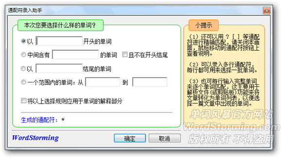 不熟悉如何输入通配符也没关系,单词风暴提供了通配符助手,可以很方便地根据您指定的条件来生成通配符: